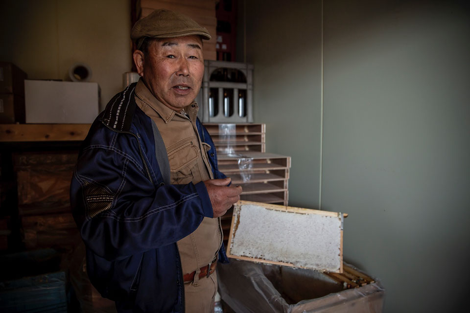 土木機械のオペレーターを辞めようと決めた時、まず「牛屋をやりたい」と洋子さんに言うほど生き物好きの文男さんは、蜜蜂に対しても深い愛情を注いでいる。
