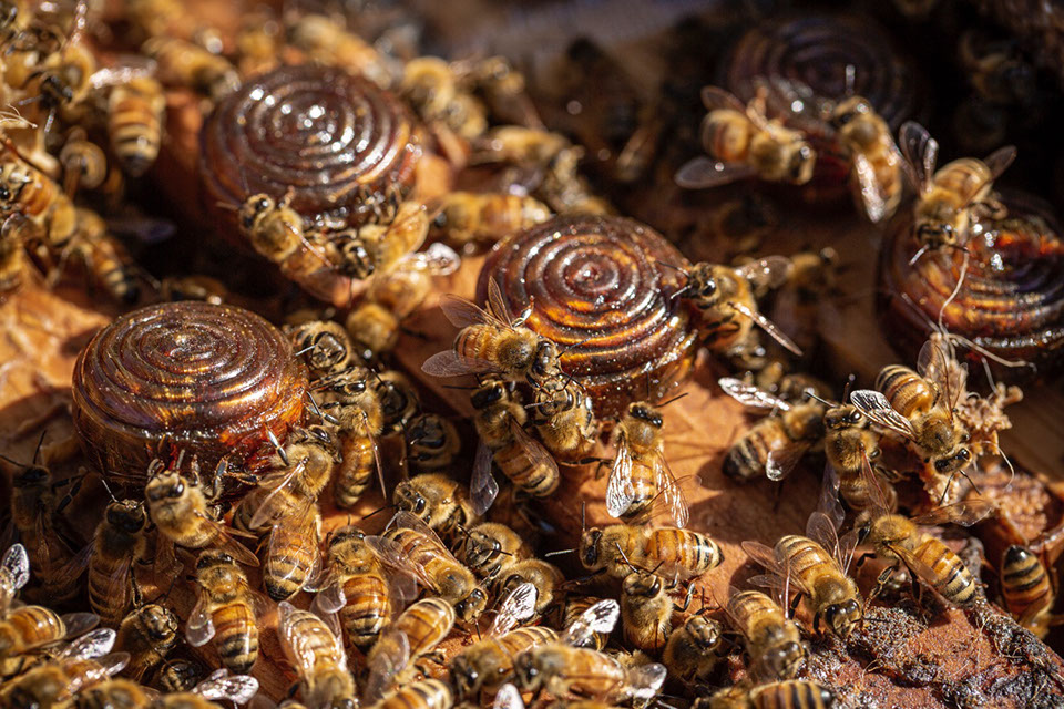 花園養蜂場の秘密の餌かも知れないが、松本さんは人工花粉や砂糖水の他に黒糖飴を与えている。「3、4日で食べきっているね。