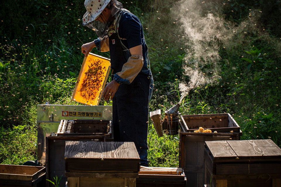 次に行ったのは、きじ場蜂場だ。縞模様のハンチング帽を被り、胸当ての付いたジーパンに革靴。およそ養蜂家の服装ではないが、これが亮太さんの普段の仕事着である。この日の作業は、秋に同業の養蜂家に売り蜂とする群の建勢(分け出し作業)だ。次々と巣箱の蓋を開けて巣板を引き上げ、群の様子を確認していく。ほとんどの巣箱に新しい巣礎枠を2枚ずつ追加していく。