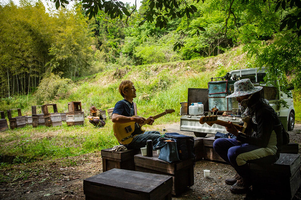 天浜蜂場での採蜜が終わった後でギターデュエットを楽しむ亮太さん(中央)と鈴木さん。未紗さんは演奏を邪魔しないように離れていた