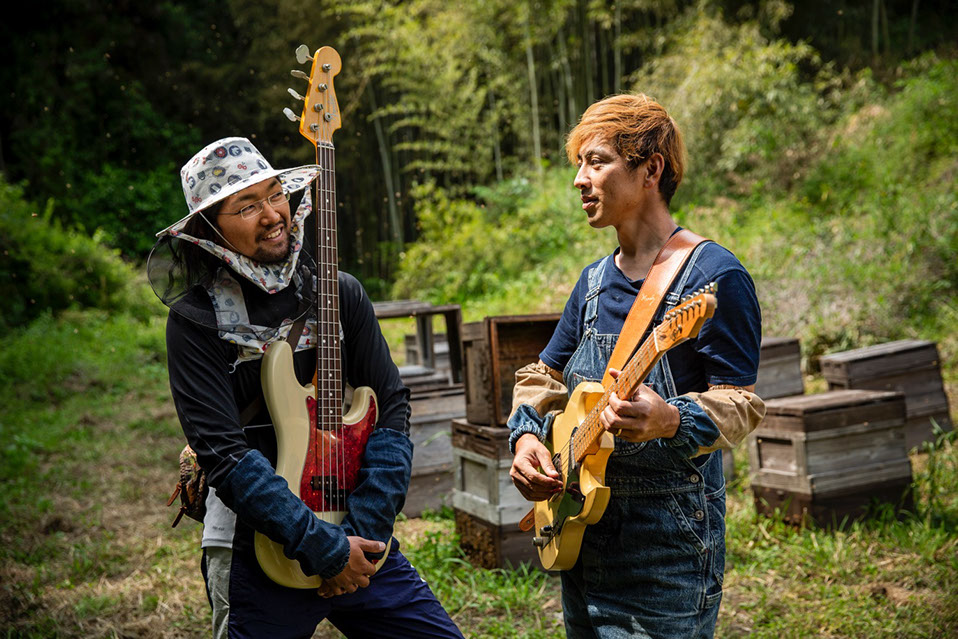 みかん蜜の採蜜が終わった後、亮太さん(右)と助っ人の鈴木さんがこれから2人で作るバンド名の話題で盛り上がる
