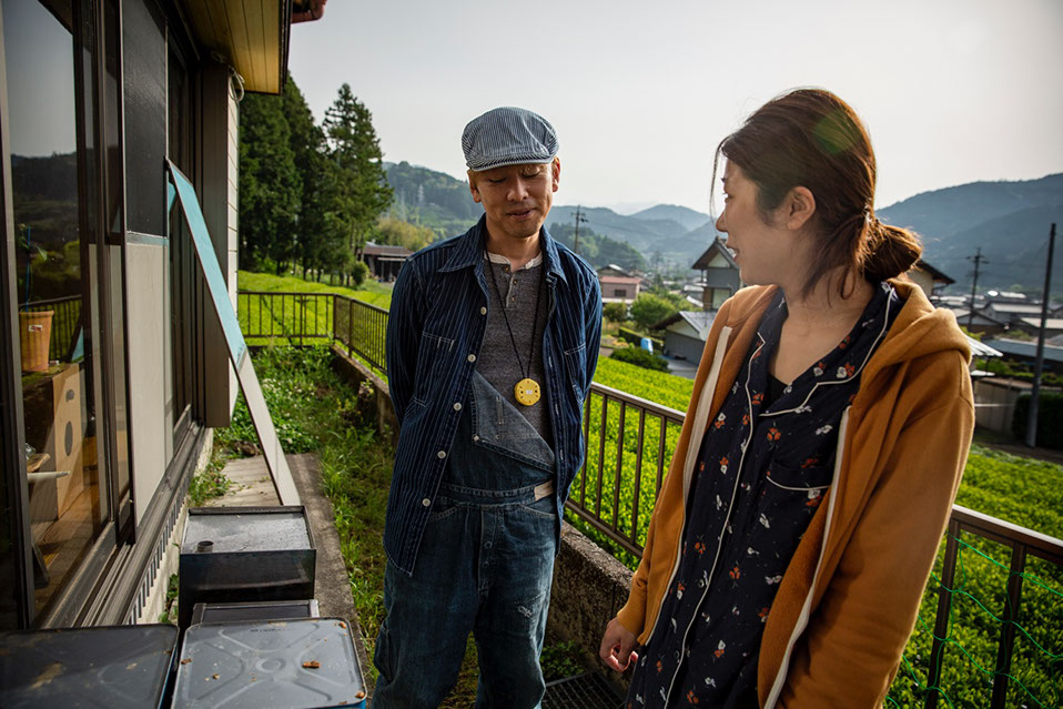 みかん蜜の採蜜が終わった翌朝、蜂場へ出掛ける亮太さんを見送る未紗さんは、この日の蜂の仕事はお休みだ