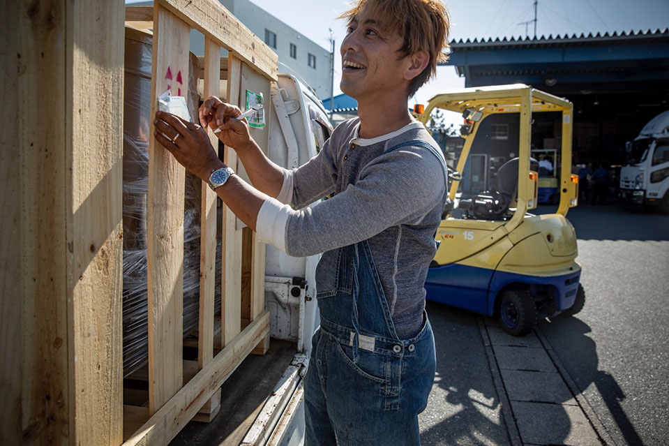 注文してあった最新式の遠心分離機が届き、浜松市内の運送業社へ受け取りに行って喜びの表情を見せる亮太さん
