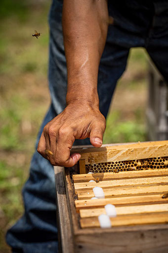 「面布を着けると負けた気がするんだよな」と、未紗さんに言う。早朝なので気温が上がらず、蜂の気が荒くなっているのだ。面布は着けたが、手袋はしないでTシャツに腕カバーだけ。「私の師匠が『刺されて覚えろ』と言う人だったので……」と亮太さん。蜂を払いながら面布も手袋も着けない理由を私に説明する。普通、蜂は巣門の前で払うことが多いのだが、何故か、亮太さんは巣箱の中へ蜂を払っている。