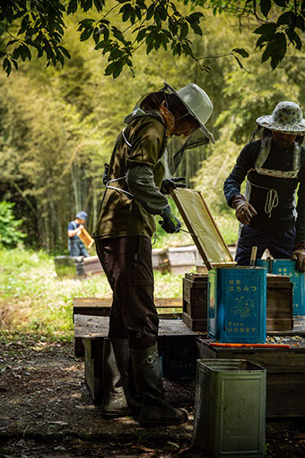それでも夫妻の採蜜作業は順調に進んでいる。遠心分離機で搾った蜂蜜を漉し器に移していた亮太さんが独り言のように呟く。「今年(の蜂蜜)はすごく白濁している。空気が多いんだね。みかん蜜の特徴でもあるけどね」。ちょっとした蜂蜜の変化にも、亮太さんが敏感に反応していることに驚く。
