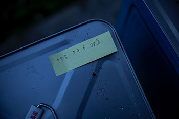パキポディウムに後ろ髪を引かれるように亮太さんが玄関を出る。青色の遠心分離機を荷台に積んだ軽トラックで、蜂場に向け出発したのは午前4時半だ。途中、運転しながら未紗さんが作ってくれたおにぎりを頬張り、コンビニでホットコーヒーを購入し、湧水が流れ出ている無人給水所では採蜜作業で使う水を一斗缶に汲み入れた。「きじ場」と呼ぶ蜂場に着いたのはきっかり6時だ。