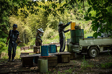 亮太さんは独りで、軽トラックに載せた遠心分離機を基点にして、蜜蓋を切る動線と採蜜が終わった巣板を元の継ぎ箱に戻す動線を作り上げる。やがて、朝の家事を済ませた未紗さんが蜂場にやってきた。