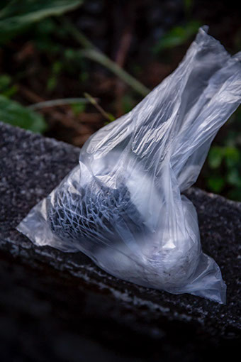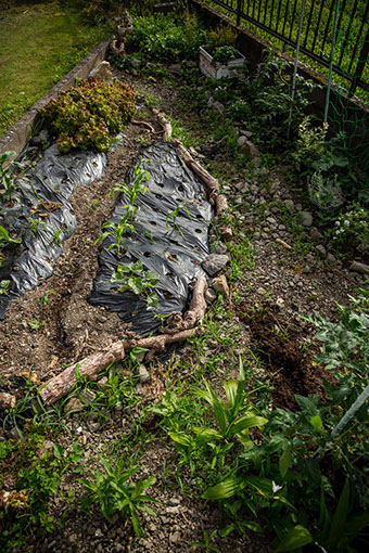 「天浜(てんはま)」と呼ぶ蜂場は、大きな白い建物が並ぶテクノ工業団地の一角から小径に入り、坂道を一気に下った谷間の広がりに18群の巣箱が並んでいた。すぐ横に小川が流れている。亮太さんは到着するなり、蜂場の端で頭を出している竹の子を蹴飛ばして折っていく。脇の竹林から竹が侵略してきているのだ。