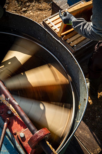 運搬箱に入れた蜜巣板を亮太さんが運ぶと、未紗さんが蜜蓋を切り遠心分離機にセットする。作業が遅れがちな未紗さんを手伝いながら、亮太さんが声を掛ける。