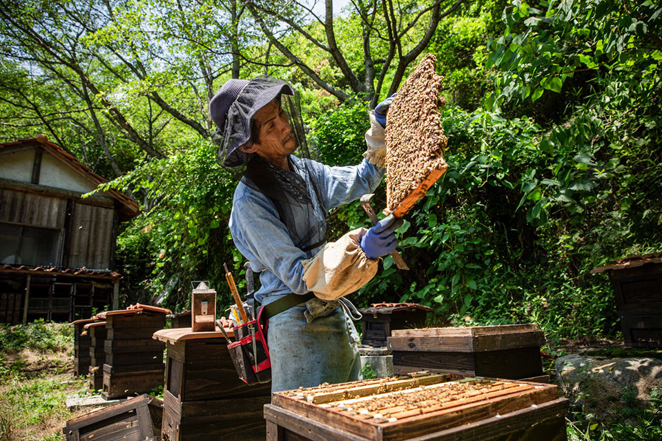「サラリーマンをしよったけど、これは時間から時間に縛られてな。養蜂をやるようになってからは時間が自由になって、こんなにも良いもんかと思いましたね。蜜蜂も奥が深いですね。教えてくれと何人も来るんじゃけど、なかなか続かんな。しかし、彼は続いた。昆虫に愛情を掛けるというのは変かも知れんけど、やっぱり愛情やと思うよ。今では彼の方になついてな。わしが蜂場に入ったらな、わしを刺しに来るんじゃからな。もう、嫌になるよ」