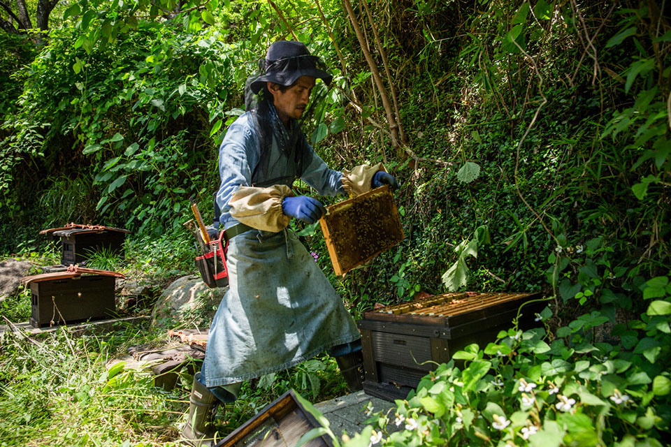 武部さんが、そう言って紹介する一の滝養蜂園の2代目は、黙々と栗の蜜を採っている森山直也(もりやま なおや)さん(49)だ。
