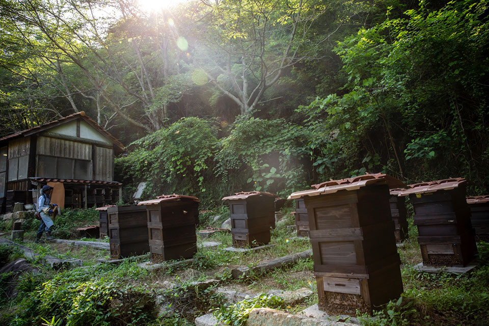 一の滝養蜂園を訪ねた6月下旬は、最後の栗蜜を採集する時期だった。玉野市を南から北へ貫いて流れ、児島湖へ流れ込む鴨川支流の渓流に作られた小さな堰を渡ると、右手下に作業場と整然と並んだ巣箱が目に入ってくる。