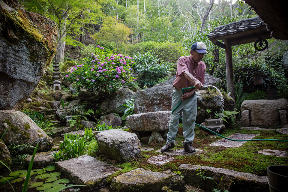 蒼穹珈琲から山道を数メートル上に行くと、武部さん自作の最後の作品である茅葺き屋根の茶室が建っている。茶室の前は自然の大岩を活かして苔むした庭園が設えられている。夕方になって茶室を訪ねると、武部さんがホースで苔に水をやっていた。