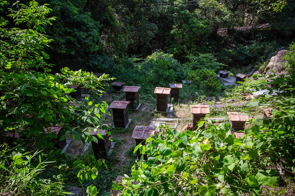 一の滝養蜂園の蜂場に並ぶ3段巣箱。巣箱の上には瓦4枚がきれいに並べて置かれ、おとぎの国の小人の家が建ち並ぶように見える