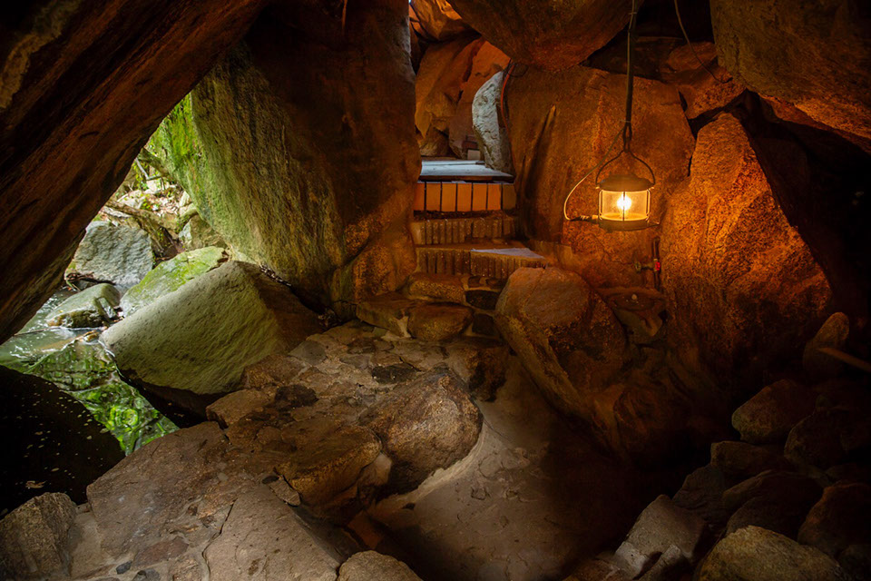 ここまで聞かせてもらって、実際に岩風呂を見せて貰わない訳にいかない。案内を請うと、「湯を張ることはできない」けどと小雨降る中、武部さんが整備した遊歩道を歩いて洞窟の中にある岩風呂へ案内してもらうことができた。人一人がようやく潜り抜けられる大岩の隙間に造られた階段を後ろ向きになって数段降りると、大岩の下は洞窟になっていて、大岩の隙間から川面を眺めることができる。地面の岩を四角く組み合わせて畳2畳分ほどの岩風呂になっている。
