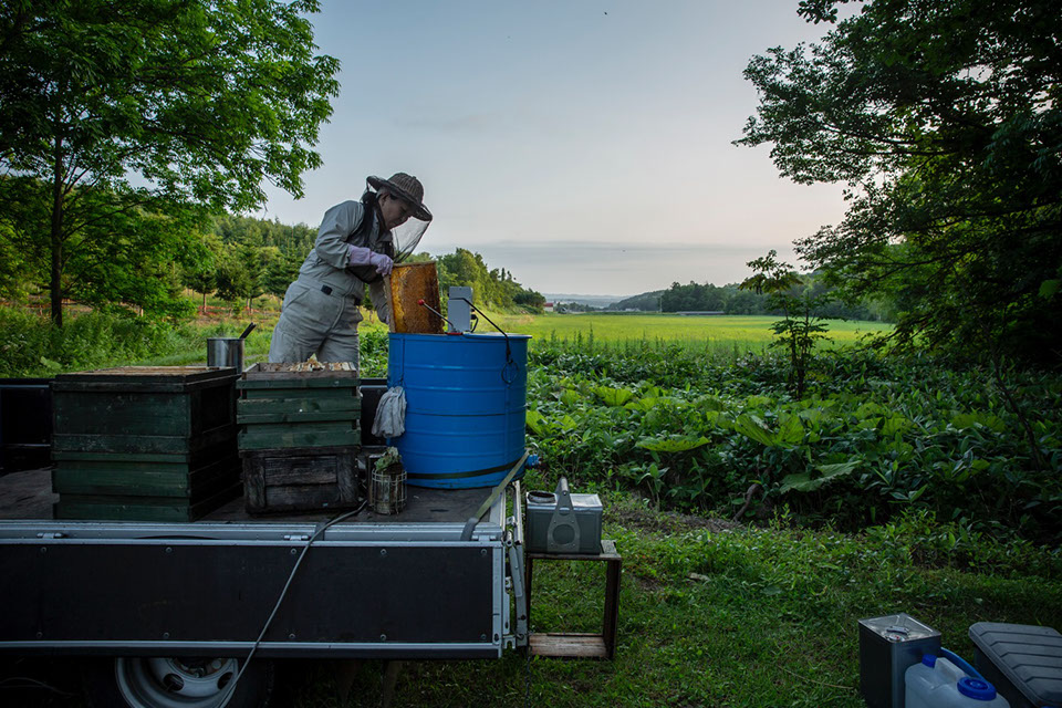 「横浜の両親が勤めを定年退職した後、長野に住み始めた時に近所の方がアカシア蜂蜜を持って来てくれて、こんなに美味しいのかと驚いたんですね。それで長野に蜂場を確保できないかと思って申請を出したら、申請したのがたまたま空白状態になっていた所で通ってしまって、長野は蜂場の激戦区なので運が良かったですね。長野のアカシアは5月末から6月5日くらいまでなんですけど、北海道へ移動する前に一旦伊豆に帰るんですけど、タイミングが合えば北海道へ移動してからもアカシアがもう一回採れますね。長野の採蜜の時は、私の両親と妹も手伝ってくれるんですよ。ほんとに家の前が蜂場なんです」