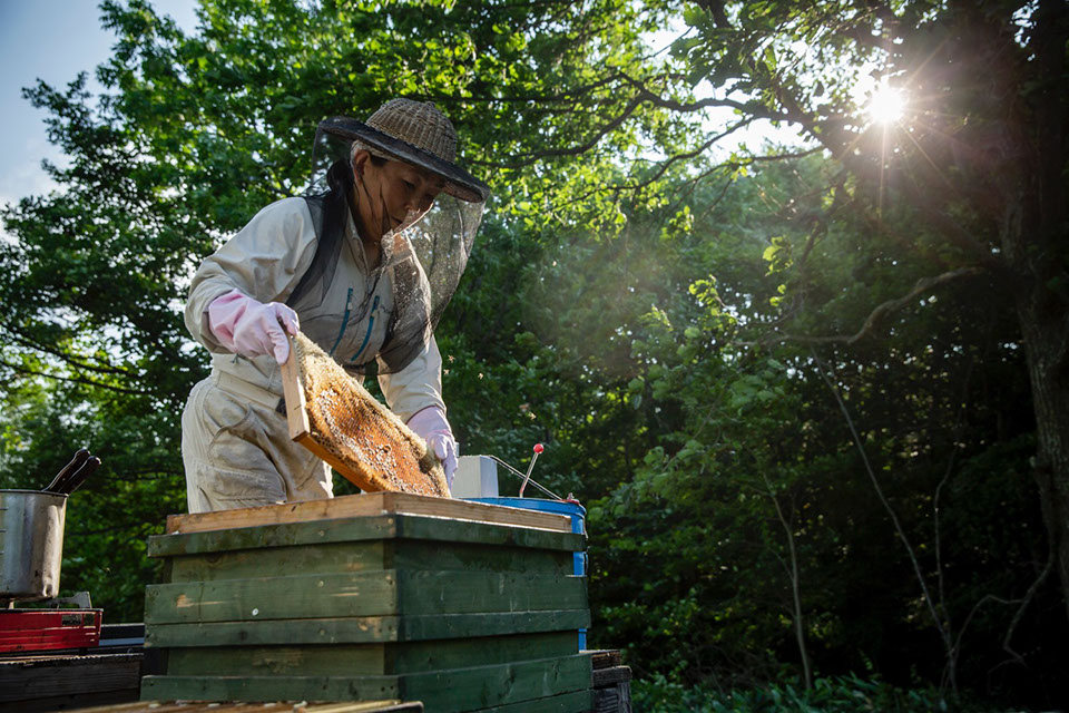 「康裕さんにくっ付いて蜂の世話にもよく行きました。康裕さんはもう蜂屋さんの心になっていて、話してくれる蜂の生態って面白いんだなあって思いました。花がたくさん咲いていれば蜂の数が増えるというように、生物は自然のキャパシティーの中でしか生きていけないことを蜂が教えてくれるという話が一番印象に残っていますね。私は、横浜の出身なので自然と触れ合う機会はなかったのですが、大学の調理学研究室で教授の助手として食の仕事をしていたんです。その頃、夏休みにはアメリカ・シアトルのマウント・レーニア国立公園で開催されるボランティアプログラムに8年ぐらい毎年行っていたんですね。その時の経験で自然の中で仕事をするのって、ほんといいなと思っていたんです。大学での仕事からオートキャンプ場の宿泊施設で働くようになったのも、そんな自然志向が働いたのかも知れません」