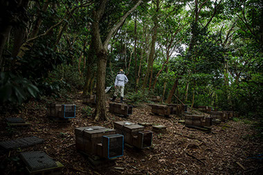この日の午後は、ヒノキ蜂場での内検。ヒノキ林の中の緩やかな斜面に置いてある巣箱を1つ1つ点検し、来春へ向けて行ってきた建勢(特別に餌を与え蜜蜂を元気にするための作業)の効果を確認する内検だ。