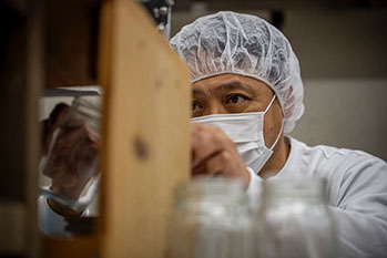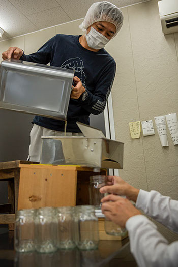 蜂蜜を計量しながら瓶詰めする理一郎さん