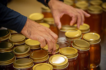 瓶詰めした蜂蜜の蓋をする良近さんの手