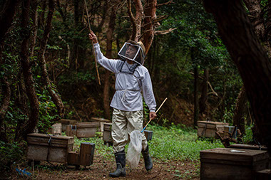 ヒノキ蜂場から出て山道を走っている時、理一郎さんが「センダングサが咲き始めましたね」と唐突に話す。「センダングサの花が咲き始めると花粉がすごく入るので、ひと安心なんです。蜂屋になる前には気付かなかったですが、今はこの花を見るのが嬉しいというか、霜が降りるまでずっと咲くので有り難いですね。以前は単なる雑草だったんですけどね」