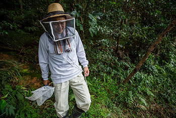 池の上蜂場に入ったとたん聞こえてきたスズメバチの羽音を追って捕虫網を手に蜂場の奥まで行く理一郎さん