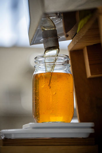 計量用のステンレス製容器に良近さんが蜜蜂を注ぐ