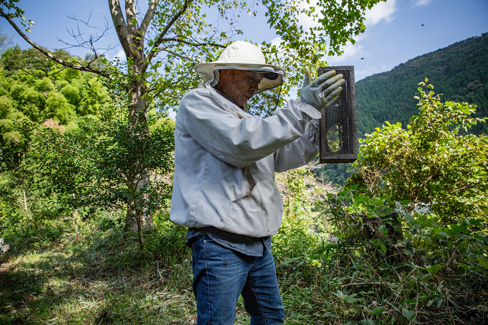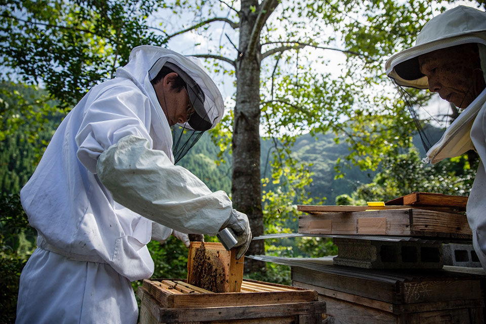 だが、次には「こいつは帰って来ているわ、大丈夫。蜂も多いわ。もう卵を産んでる」と、声が弾む巣箱もある。卓美さんと並んで内検をしていた達彦さんが「この子は少し荒い群なんです。女王蜂を替えたから、次に子どもが生まれてきたら、少しは温和しくなるんじゃないかと思うんです」と、すでにいっぱしの養蜂家のような説明だ。