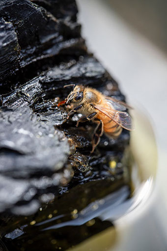 0.3%の食塩水に木炭を置いた水飲み場で、蜜蜂が口吻を出して水を飲む