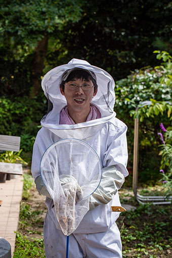 スズメバチを捕るため捕虫網を手にする住田達彦さんは、1年ほど前から父親と一緒に養蜂を始めた