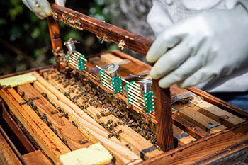 巣枠に取り付けた王籠に女王蜂が誕生しているかを確認する卓美さん