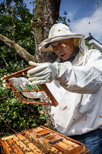 岡山県真庭市を貫いて流れる旭川にほど近く、歴史を感じさせる紙屋地区の一角にMITSUBANCHI BEE FARMは在る。しかし、教えていただいた38(みつばち)番地に養蜂家の自宅らしい目印がなく戸惑っているところに、ご本人の住田卓美(すみた たくみ)さん(74)が姿を現してくれた。