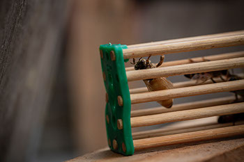 卓美さんが王台枠を入れた巣箱の蓋を開けると、まさに今、先端を喰い破って生まれ出ようとしている王台があった。その王台を手に取った卓美さんが、啐啄(そったく)同時を実践するように王台の先端の殻を少し剥がしてやると、女王蜂が待っていたように顔を出す。女王蜂誕生の瞬間だ。まだ翅は伸びきらず体は白っぽく弱々しい。この新女王蜂を王籠(群に馴染むまでの間、女王蜂を働き蜂が襲うのを防ぐための籠)に入れて、無王群の巣枠の間に挟み込み、時間を経て受け入れてくれれば新王の導入が完了となる。