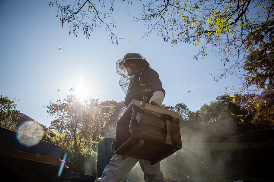 「蜂の量に合わせて出来る限り蜂を詰める作業なんです。蜂の量、餌の量を見て、問題ないな、又、来年よろしくという感じなんですけど……。無事に越冬させるのに必要なのは、蜂の量と貯蜜の量なんです。採蜜が終わると、すぐに群を3つに分けるんです。女王蜂の居ない群には早い時期に女王蜂を作って産卵させ、蜂数を増やしながら暑い時期に餌を沢山与えて、充分な(餌になる)蜜の貯えがあるようにします。冬を越す蜂に苦労させちゃいけないので、そのために大切なのは10月前半までには給餌を終わらせることなんです。寒くなってきたら働かないでおとなしくしていて欲しいですからね」