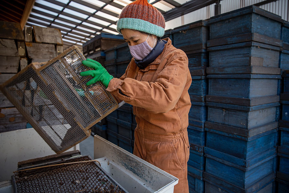 「来年の春に出荷する蜂はもう決めてあるんで……。後で選ぼうと思っていると迷ってしまうので、(採蜜が終わってから)7月に3つに分ける時に元群は出荷用と決めておくんです。3月になると出荷用は餌を多く与えるし、採蜜群はできるだけ自然に任せますね」