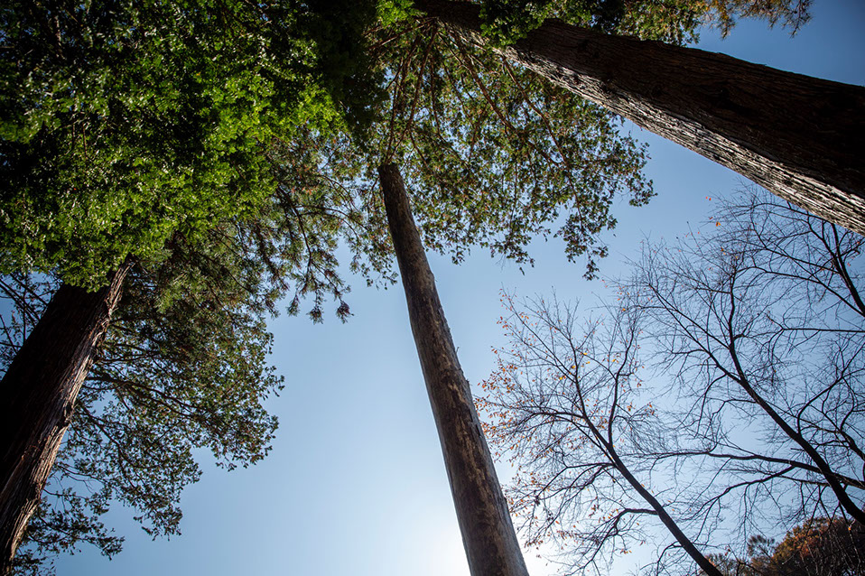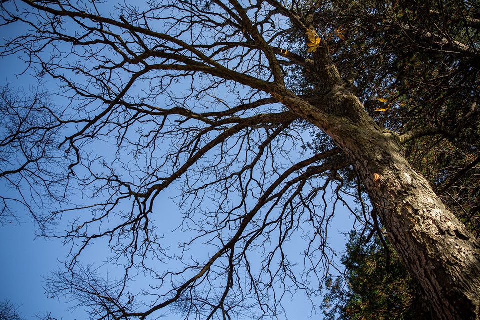 養蜂での考え方では反発をしたかも知れないが、生き方には父親の影響を受けている康さんなのだ。境内をぐるりと回ると拝殿横に根元が苔に覆われたトチの古木が聳えていた。葉は落ちているが迷路のように横へ伸びた枝が凌いできた風雪を感じさせる。