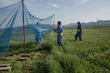レンゲ畑が満開になった頃に巣箱を置く準備のため、防風ネットを張る中村邦博さんと長男の晃さん(右)と二男の規裕さん(左)