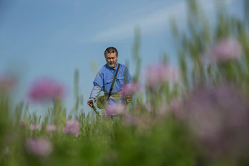 レンゲ畑に巣箱を置くため、草刈りや防風ネットを張るなどの準備をする中村邦博さん