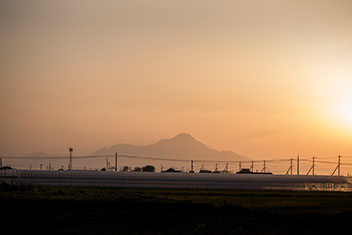 |この日は、巣箱を置く準備をしただけだった。レンゲ畑が満開になるには、まだまだ日数がかかりそうである。陽は西に傾いたが、遅くなってハウス農家が来るため、しばらくは待機の時間だ。ふと目を遣ると、有明海を挟んだ島原半島の普賢岳が、意外と近くで夕陽に照らされ黄金色に輝いている。