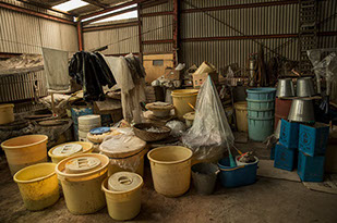|遠心分離器を始め、蜂蜜を漉す網やタンクなどを、水圧洗浄機で洗って天日に干している。ふつう養蜂家は、巣箱を置いている養蜂場の現場で採蜜するのだが、中村養蜂園では蜜の溜まった巣板を持ち帰って、自宅の広い倉庫で採蜜する方法をとっている。