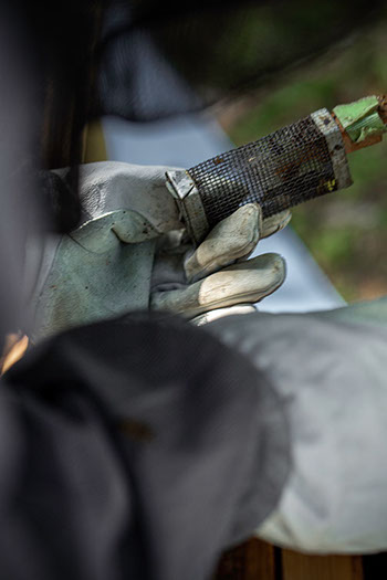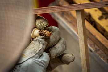 少し不安がありそうだったが、高幸さんは巣箱の蓋を開けると並んだ巣枠の上に王籠を置き、数秒間様子を見ると躊躇なく蓋を被せた。新王が群に馴染むまで、しばらく王籠に入れたまま巣箱に置いておくのだ。