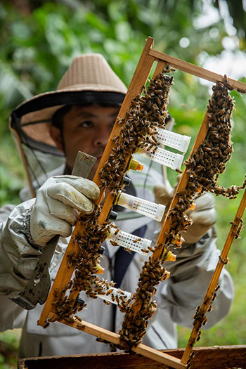 「いつも内検は午前中で終わらせているんですよ。午後からは蜂が(巣箱に)返ってくるんで、箱の中がワサワサしてくるんで……」と、高幸さんが意を決したように熱帯樹林の中に点々と置かれた一番手前の巣箱の蓋を開ける。
