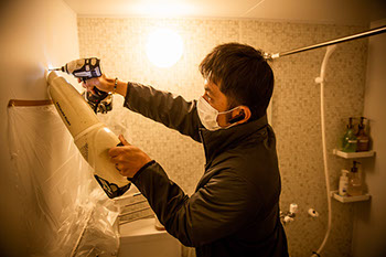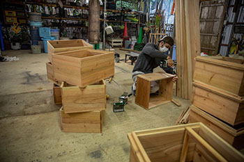曇り空の午後、高幸さんは森井農場の作業場で巣箱作りに励む