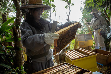 高幸さんと蘭さん、森井蜂場で。それぞれが自立した養蜂家として認め合い蜜蜂と接する2人の姿は新鮮