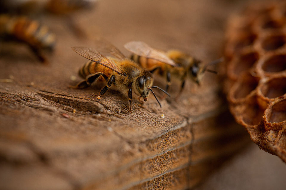 両脚に花粉団子を付けて帰ってきた外勤蜂。花粉と蜂蜜を内勤蜂が混ぜて食料とする