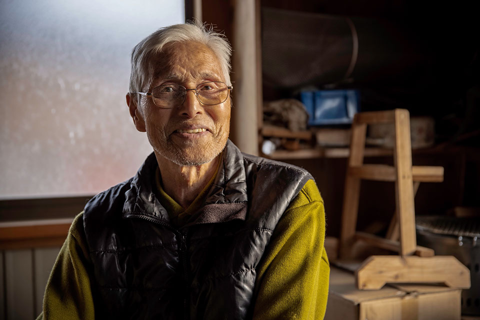 電動工具が据えられ、木片や鋸屑が作業台の上に散らばっている。青いビニールシートを潜って木工場のような空間に入ると、一段高くなっている奥の窓際で大谷朝丸(おおたに あさまる)さん(84)が、巣枠を組み立てていた。