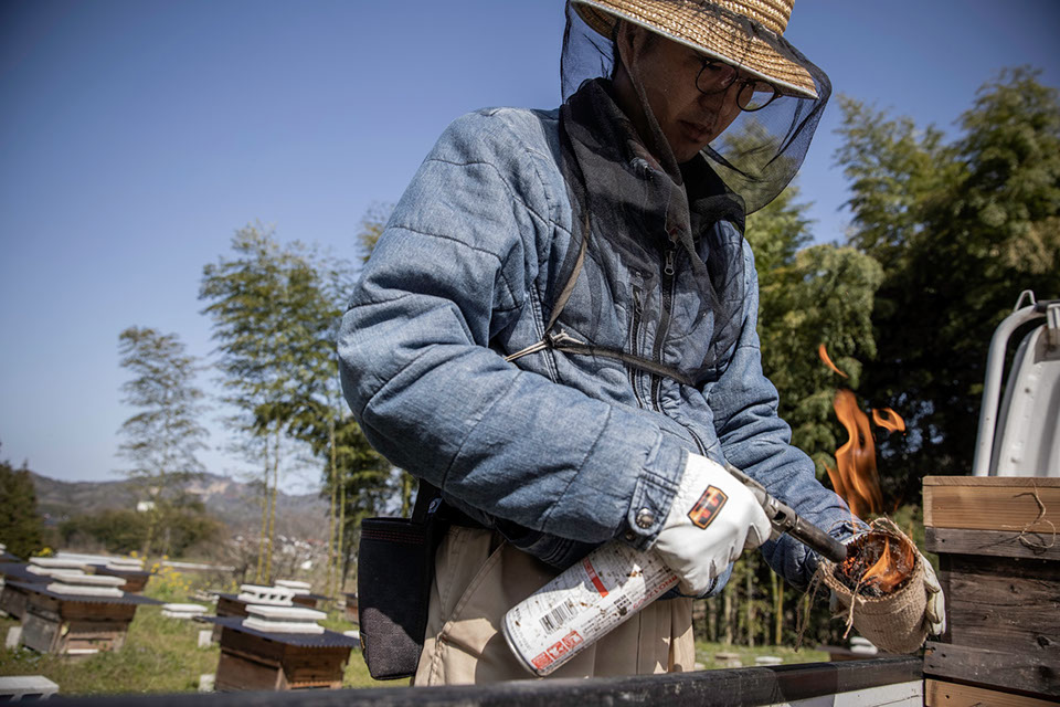 蜂場に着くと、大谷祐輝さんは最初に燻煙器の燃料にする麻布に火を点ける。養蜂家にとって面布とハイブツールそれに燻煙器なくして