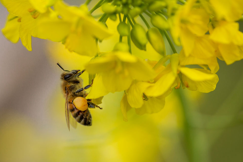菜の花が満開の時季を迎えていた。外勤蜂が両脚に菜の花の花粉団子を付けて巣箱に帰り始めると、いよいよ採蜜の時も近い