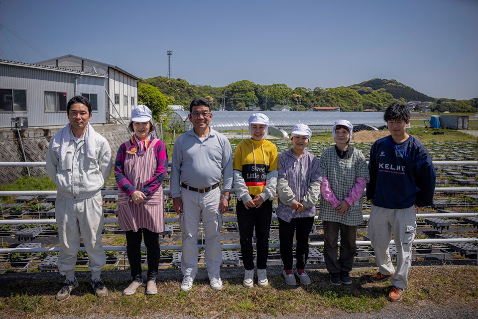 イチゴの箱詰めがひと区切りついた午後、ファーム貞光の全従業員が集合写真