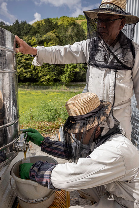 レンゲ蜜の採蜜を終え、誠一さんが味を確かめるように蜜を舐めてみる